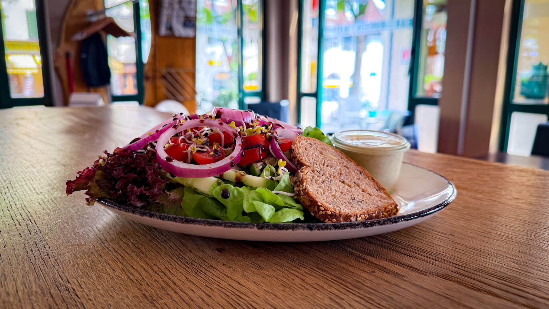 Frischer Salatmix aus Lollo Rosso und Blattsalat mit bunter Paprika, Gurkenschnitze, Tomaten und einem hausgemachten Dressing deiner Wahl. Ein bissle Brot ist auch dabei.