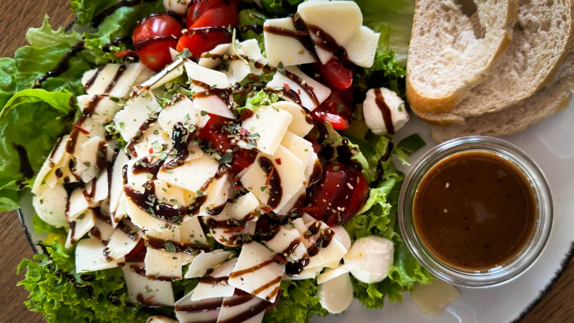 Unser Salatmix aus Lollo Rosso und Blattsalat mit Mozzarella, Parmesan und frischer Paprika, Tomaten und Gurkenschnitze. Dazu empfehlen wir unser hausgemachtes Balsamico Dressing.