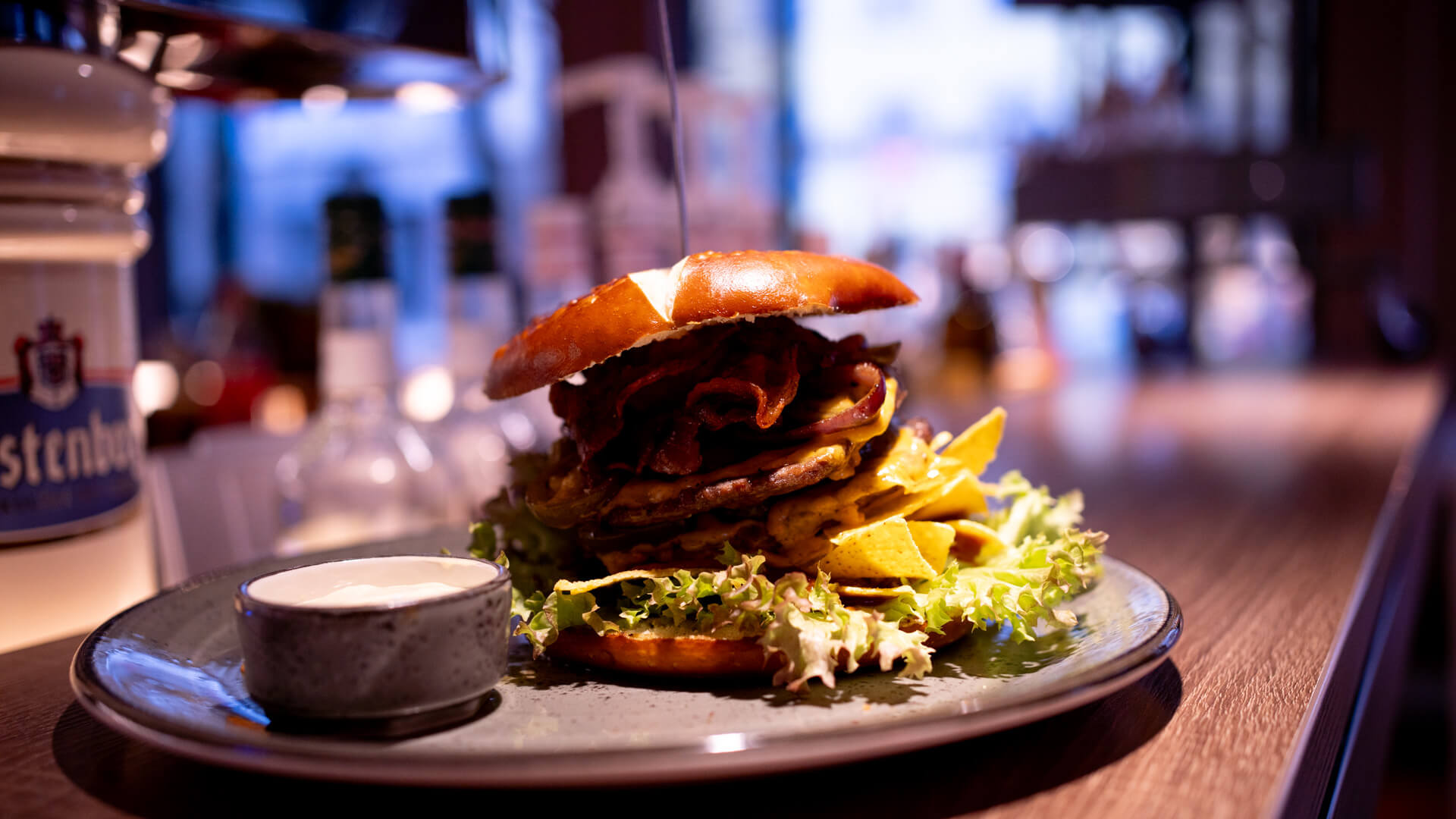 Das immer sehr leckere Laugenbun mit 200gr pures Rind und Cheddar. Das Ganze mit BBQ Dip, Schmelzzwiebeln, Bacon und Jalapenos kombiniert. Herzhaft lecker!