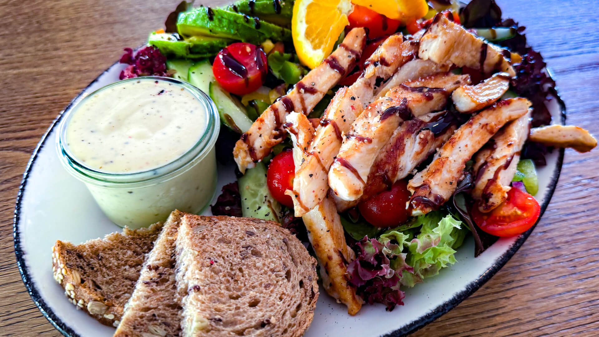 Mit Hähnchenbruststreifen, Tomate, Gurke, Avocado, Paprika, Radieschensprossen und Joghurtdressing als Empfehlung!
