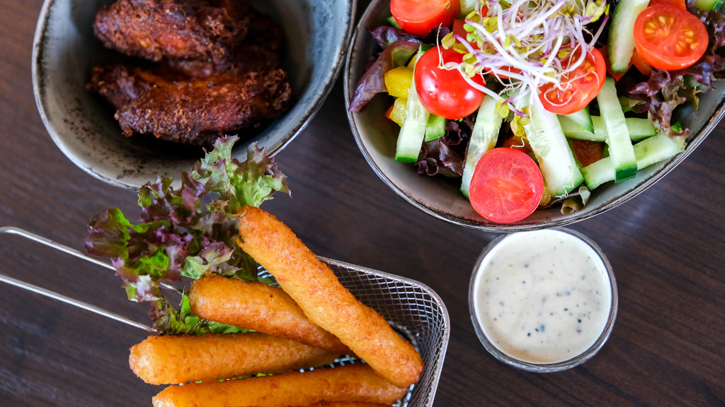 Leckere Mozzarella-Stangen aus echtem Mozzarella-Käse im knusprigen gold-braunen Bierteig - inkl. einem Dip deiner Wahl